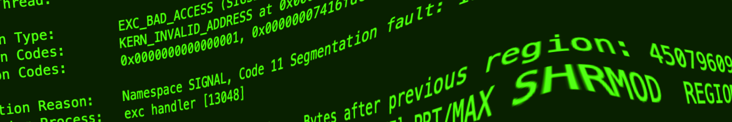 As to the title, I wanted something vaguely techy, but not overly descriptive. This feels like film underscore or a middle track in a chill electronic album. Lizzi and I had talked about programming, and I’ve been having a lot of crashes with normally rock-solid Digital Performer this month. Every single one of them has been a segmentation fault error.6The featured image of this post is a screenshot of one of my crash logs. So there we go!