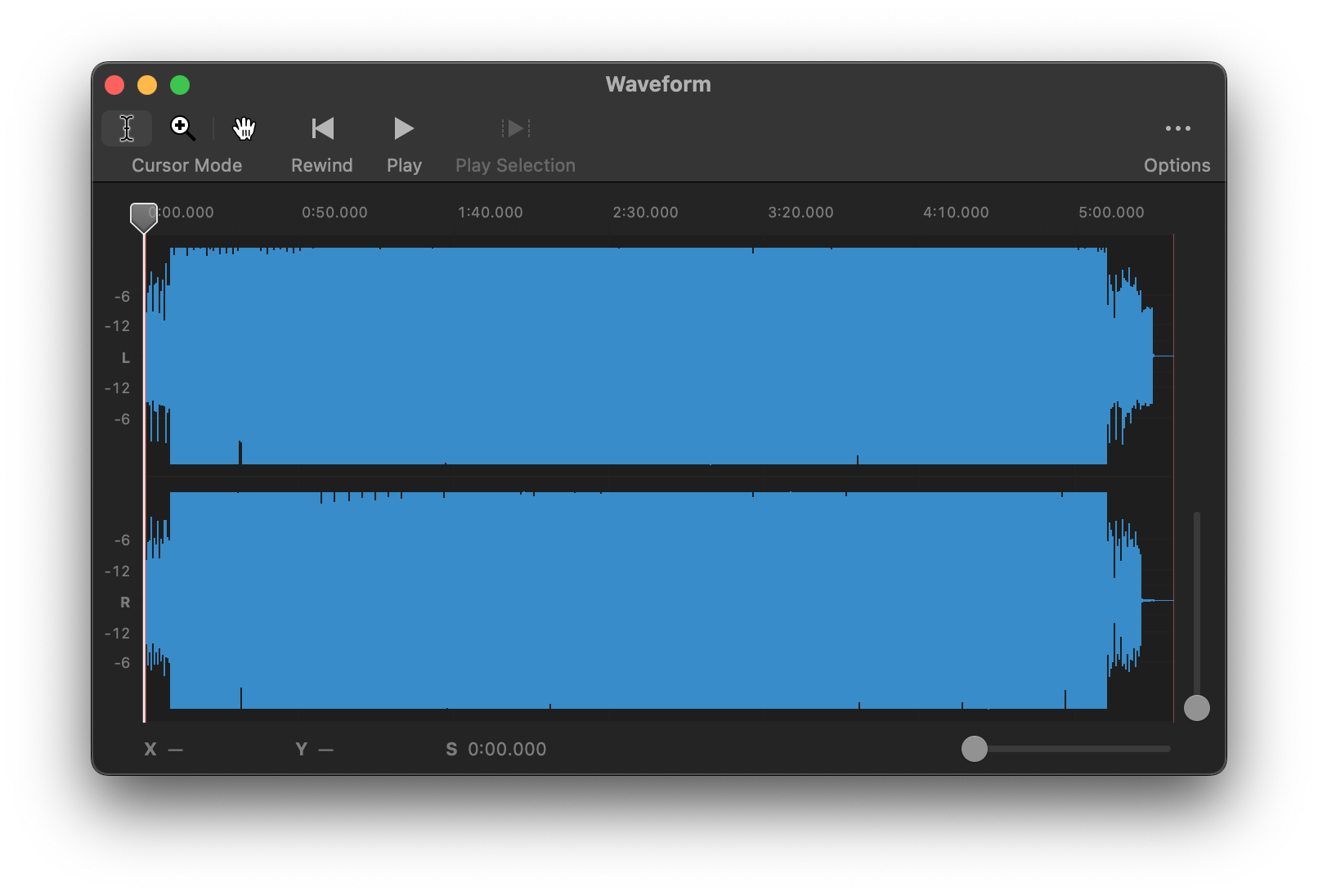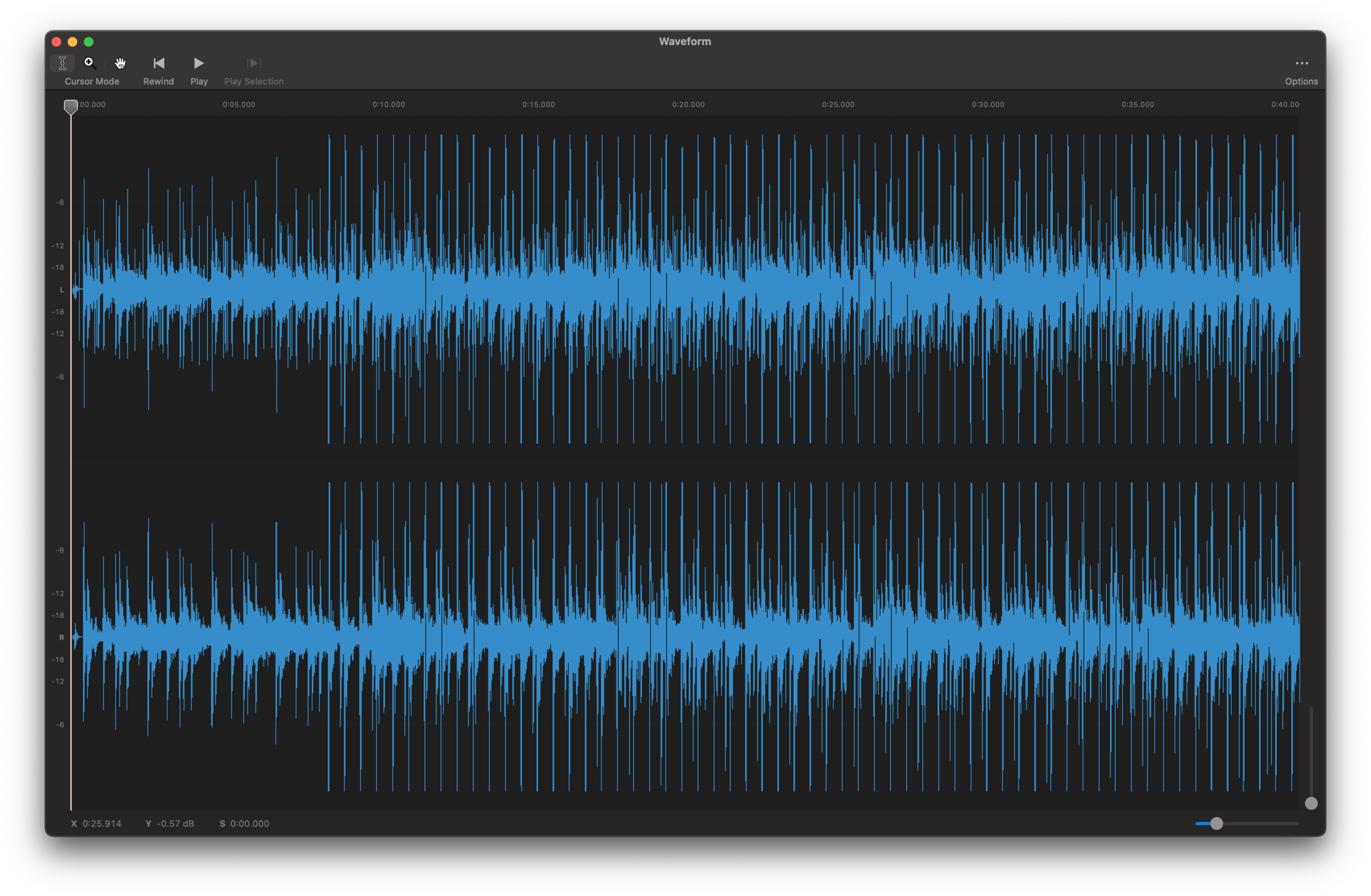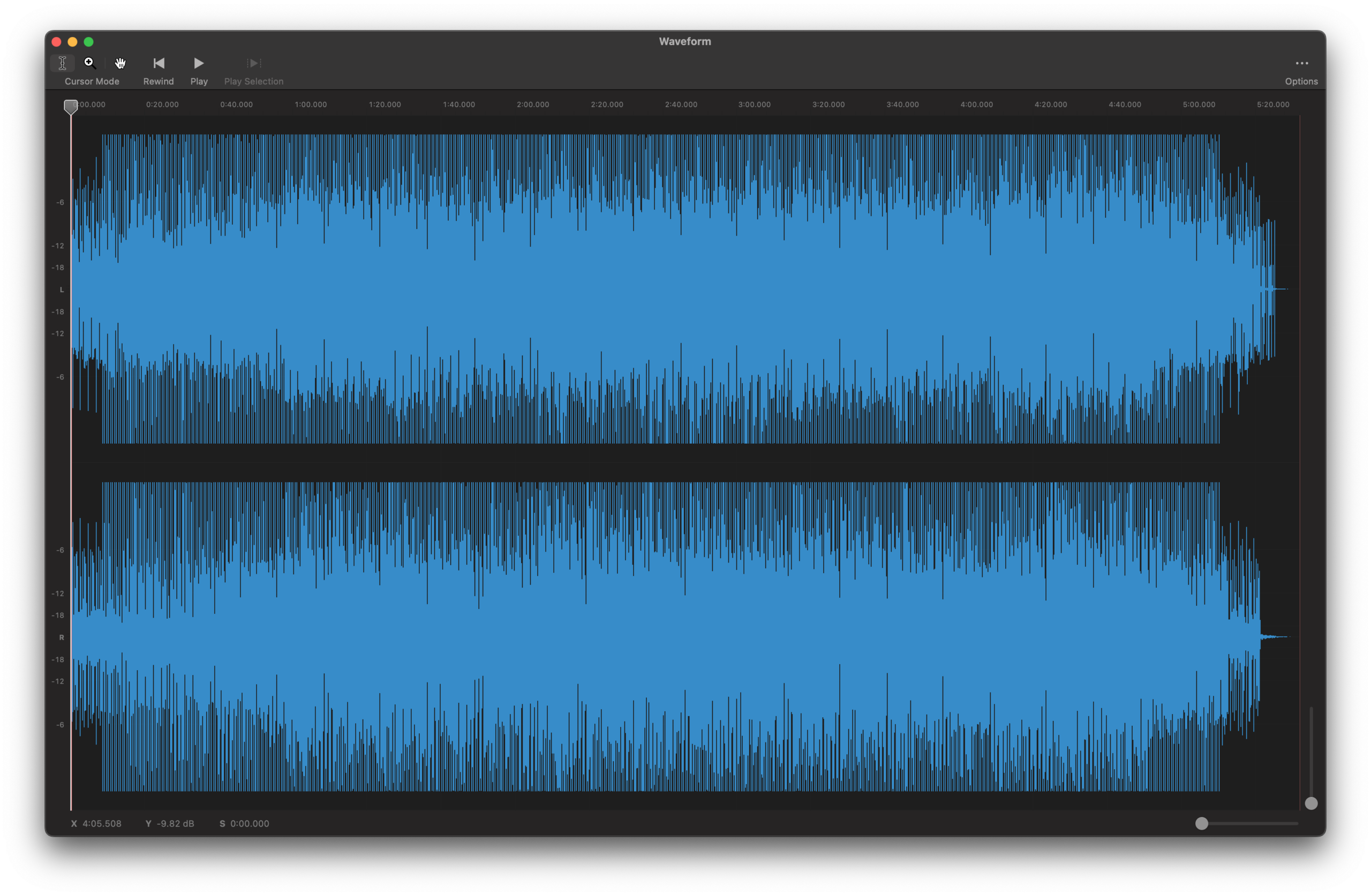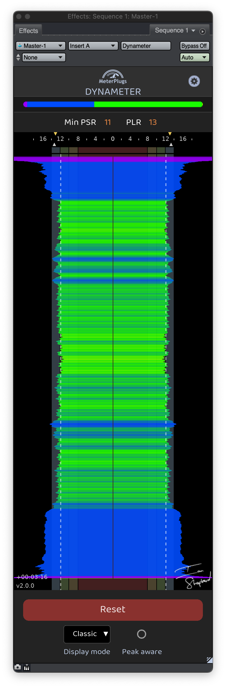 While I was doing some additional cleanup, I happened to look at the waveform pattern for the mastered track. It looked like a sausage! No peaks and valleys, just a solid block. This typically means that the track is over compressed and waaaaaay too loud with no dynamic range at all. But it sounded good. And how the hell did I go from too dynamic to Metallica Death Magnetic?4Widely regarded to be the worst-mastered album of all time. It has since been corrected, but anyone who’s read up on the loudness wars will have heard about this one. And why wasn’t Dynameter showing me a completely red overview?