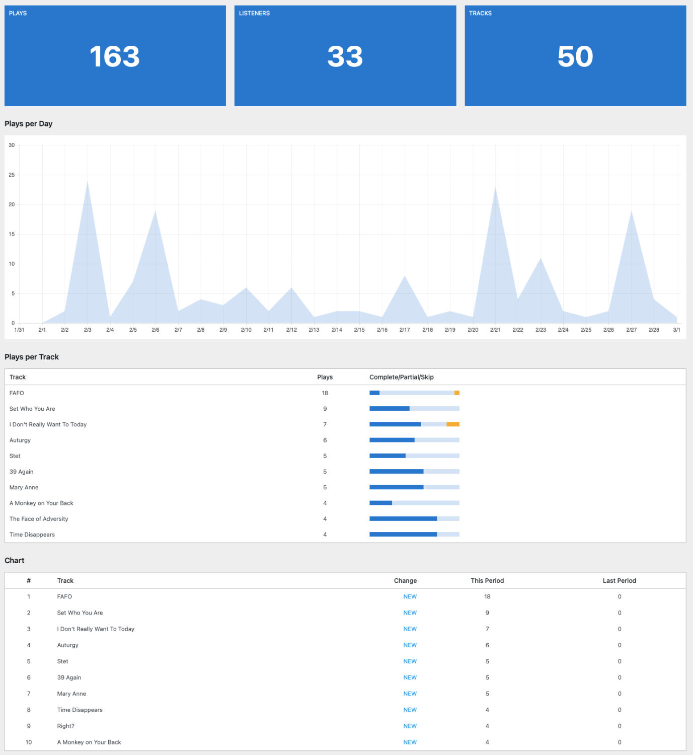 As far as listeners, I’m not really sure how indicative my site stats are, because I think most people listen on the official site. However, I was surprised to see 33 discrete listeners. I do one test listen when I post, but only one, so I can subtract 30 from the play count, and at least three from the number of listeners.7 My two computers and my phone. It may be higher than that if I forgot to turn off my VPN before listening, but let’s not do that and just pad the stats a bit. Over the years, the number of people listening on my site has grown, so that’s good, but I don’t think this info is overly valuable, so I probably won’t track it in the future. I’m also moving to a different audio player for the site. I’ll lose some of the functionality I had, but I’ll be gaining some other stuff that’s better.